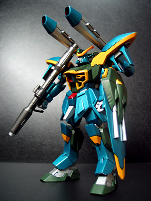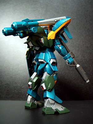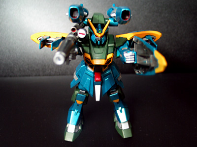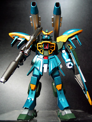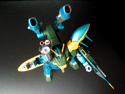 | 【えのっちのひと言】 またメタリック塗装やってしまいました。青系のメタリックは初めてでしたが、これもなかなかいいですね。メインの色は、メタリック・ブルー、メタリック・グリーン、シルバー、ダークグリーンなどを、箱の絵を見ながら調合しました。濃い緑はダークグリーン+シルバー、黄色系の部分は黄橙色です。パーツ分けはあまり細かくない割に、色分けが複雑で、塗りはとにかく大変でした…苦心作です。 |