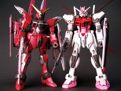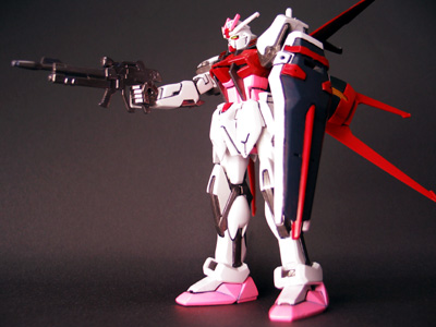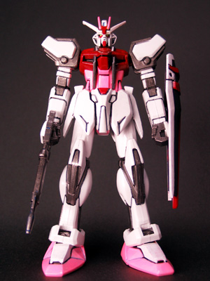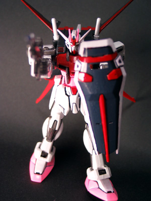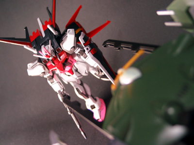 | 【えのっちのひと言】 いよいよ最終回weekで、気分的に盛り上がっていて(何かSEEDがらみのことをやっていないと落ち着かない)…一気に作ってしまいました。本体は1/144「ランチャーストライク」のものを、エールストライカーは1/144HG「エールストライク」のものを使っています。 |
